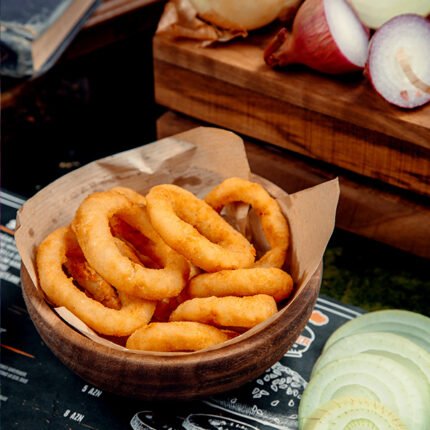 Fried round shaped Spanish onions with gram flour, and Indian spices